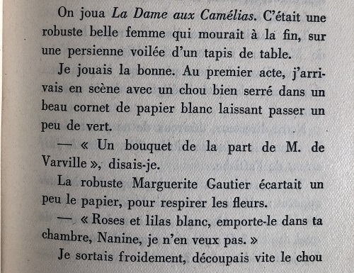 Enlevés d’une plume vive et imagée, ces mémoires pétillent d’esprit. La comédienne raconte avec malice et drôlerie ses débuts peu prometteurs, les répétitions, l’ambiance des coulisses. Au fil des pages entrent en scène débutantes et vieux cabots, régisseurs, habilleuses, metteurs en scène et autres gens de théâtre chez qui solidarité de troupe et jalousie professionnelle font bon ménage. Particulièrement réjouissante est l’évocation des tournées de province calamiteuses où la débrouillardise compense un manque criant de moyens, devant des parterres indulgents qui en ont vu bien d’autres. Notre aspirante tient chaque soir plusieurs petits rôles tout en assurant les fonctions de bruiteuse, de musicienne et d’accessoiriste. Ces anecdotes alternent avec des observations bien vues sur la psychologie du public, l’évolution du jeu théâtral, les tout débuts du cinéma. Ajoutons que le texte est illustré de vignettes, où la mémorialiste fait montre d’une même vivacité de trait que dans son récit.