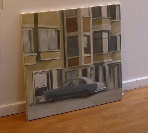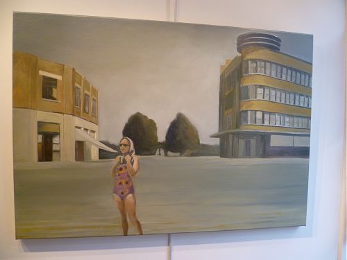 Henri Sarla n’est certes pas le premier à utiliser des photographies comme matériau de base d’un travail pictural, mais il en tire les éléments d’un univers singulier. Il a commencé par travailler à partir de photos de vacances à la mer puisées dans ses propres albums de famille, avant d’élargir sa cueillette à des photos de famille anonymes des années 1950-1960 trouvées dans les brocantes. Photos amateurs souvent floues ou mal cadrées, élues dirait-on à proportion de leur maladresse et de leur banalité. De la reproduction de ces clichés 1, il tire, plutôt qu’un effet hyper-réaliste, un effet d’irréalité, de vie immobile, de temps suspendu, sinon d’angoisse muette, dont la sidération douce — jeux de lumière et décadrages aidant — ne va pas sans rappeler le monde médusé d’Edward Hopper. Aussi inscrits soient-ils dans une époque précise (que connotent les architectures, la mode vestimentaire et ces voitures qu’on dirait stationnées là pour toujours), les mariages et les réunions de famille tristounettes, les souvenirs balnéaires et les espaces urbains désertés comme après la fin du monde sont moins, chez Sarla, des vecteurs de mémoire et de nostalgie que d’une étrangeté presque onirique.