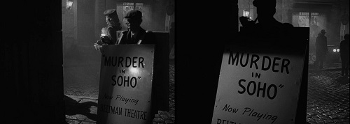 L’exposition, exemplaire de densité dans la concision, donne le la. En quelques minutes où les plans s’enchaînent de manière à faire travailler l’intelligence du spectateur, la situation est posée de manière intrigante et claire. On épinglera notamment un plan admirable : une jeune écervelée court à son rendez-vous avec le tueur. Elle le retrouve au coin d’une rue. Le coin de la façade masque la silhouette du tueur, dont seule l’ombre se dessine sur le pavé (souvenir, peut-être, de M le maudit). À ce moment s’avance vers nous un homme-sandwich annonciateur du destin, faisant de la réclame pour une pièce de théâtre intitulée Murder in Soho (now playing, en effet, sous nos yeux !). Lorsqu’il quitte le champ, le couple à l’arrière-plan s’est évanoui.